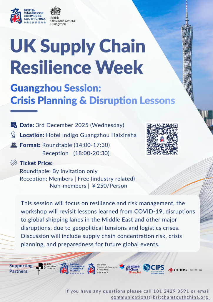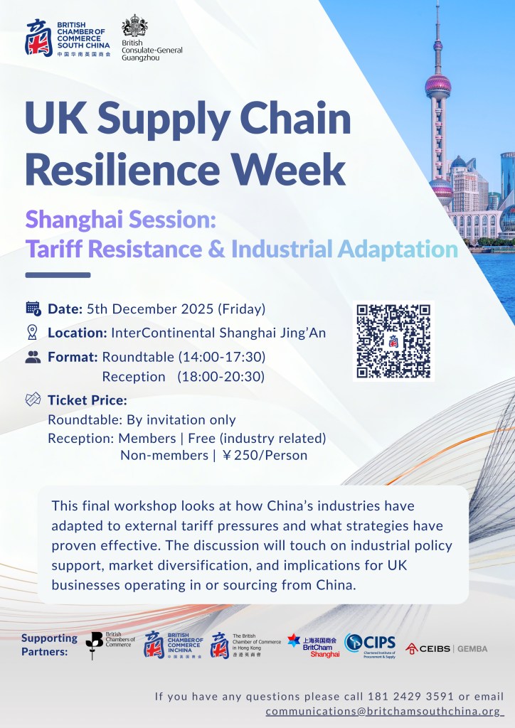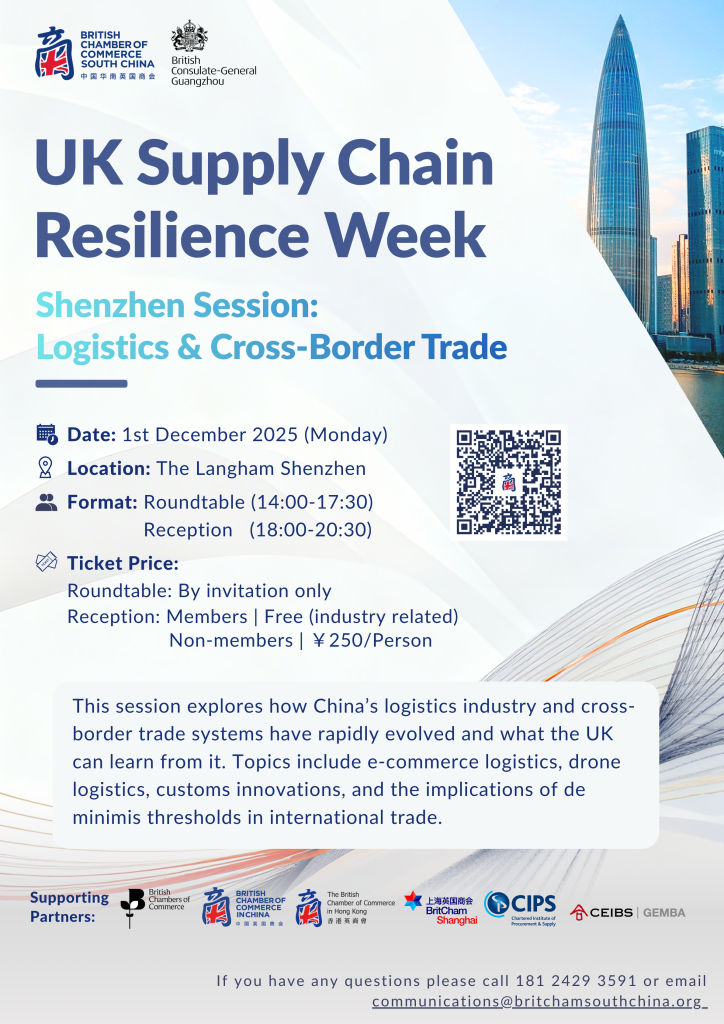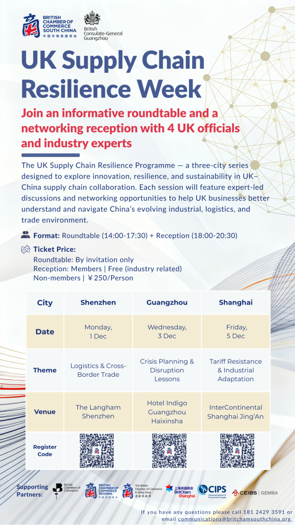 Amidst global trade shifts, supply chain resilience has become critical to economic security. To strengthen UK-China industrial collaboration, the British Chamber of Commerce South China presents the UK Supply Chain Resilience Week 2025, empowering businesses to navigate challenges and seize new opportunities.
