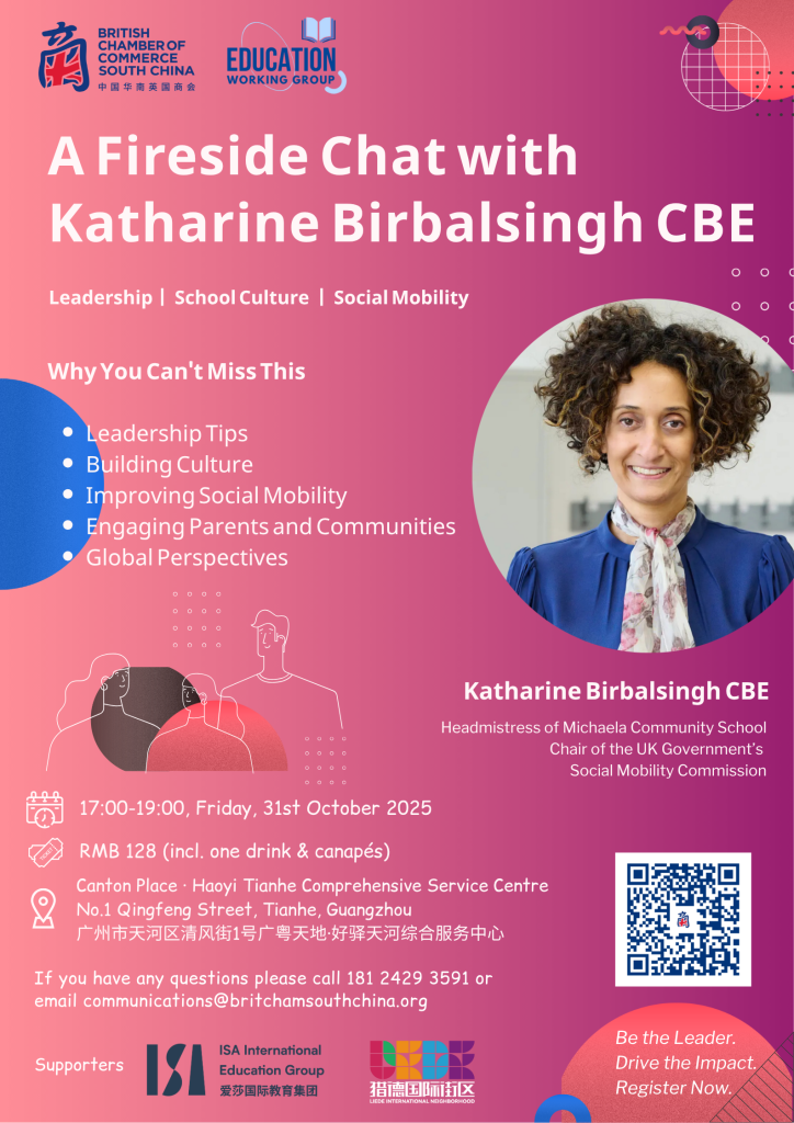 In 2021 she was appointed Chair of the UK Government’s Social Mobility Commission, where she championed evidence-based strategies to improve opportunities for disadvantaged young people. Her visit to Guangzhou offers BritCham a unique opportunity to hear first-hand insights from a globally recognised thought leader on education and leadership.