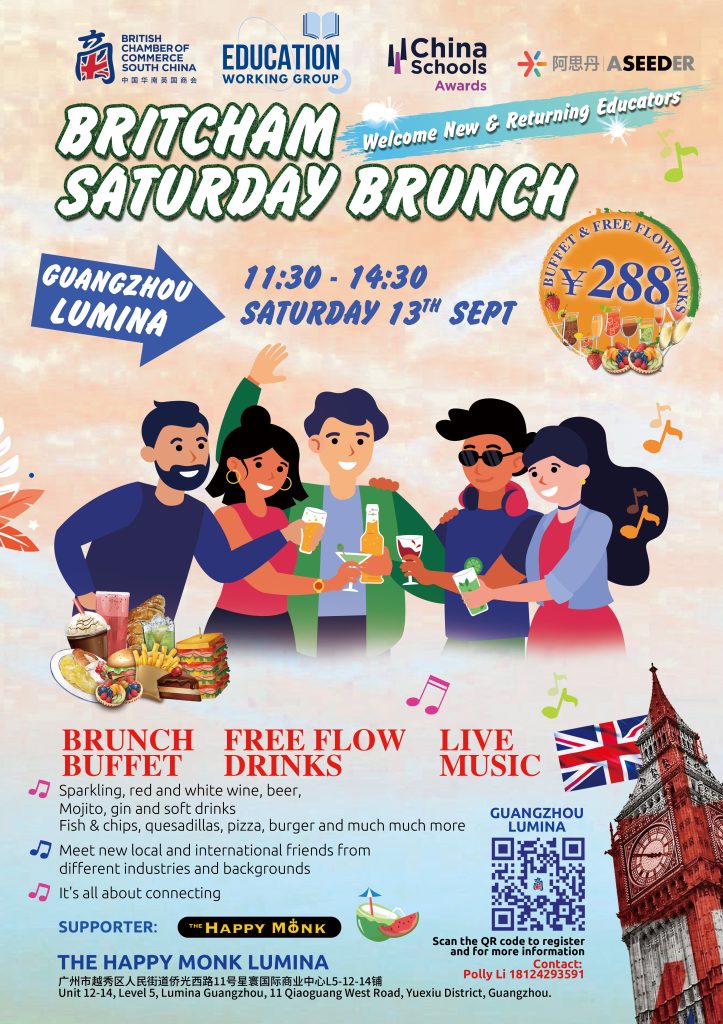 我们一季一度的、由教育工作小组举办的英国商会周六早午餐会回归了!快来与我们在 9 月 13 日(广州场)一起享受美好周六——我们欢迎来自教育界的新朋友和老朋友们一起来参加。